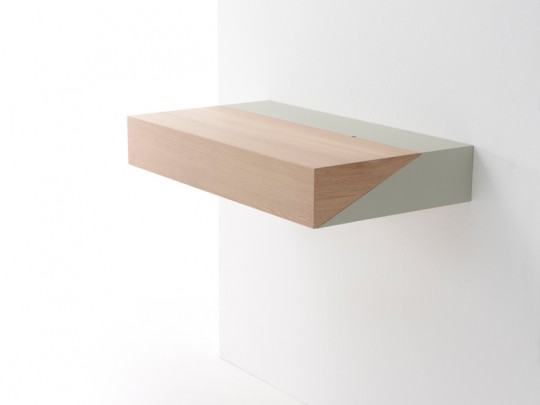 La conception de ce bureau mural est vraiment intéressante. Les designers du studio Raw Edges (Yael Mer et Shay Akalay) ont imaginé une forme parallélépipédique, composée de deux parties aux matériaux différents, bois naturel et métal laqué, qui s’emboitent l’une dans l’autre pour former une boite fermée. Très ingénieux et surtout bluffant en terme de design. Je suis fan.