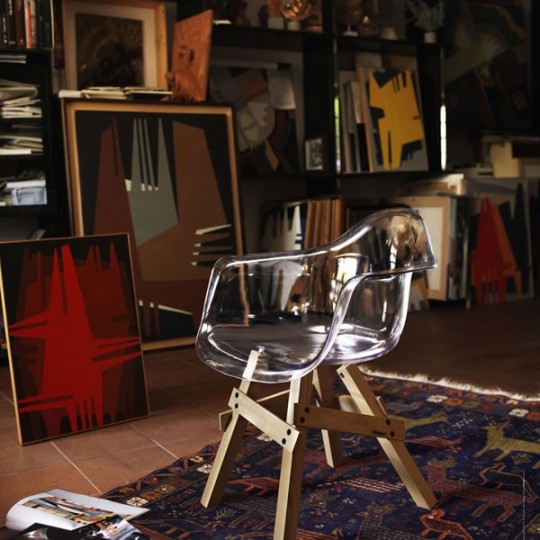 Ce fauteuil Icon Poltrocina a comme un petit air de famille avec le mythique fauteuil DAW de Charles Eames. Hommage ou inspiration ? Quoiqu’il en soit le designer Sander Mulder a eu l’idée d’apporter sa touche personnelle à cette icone du design des années 60 en asseyant la coque en polycarbonate transparent sur un piétement composé de planchettes en bois rivetées les unes aux autres de façon nonchalante. Â Un petit côté home made qui fait toute l’originalité de cette chaise Icon Poltrocina éditée par Kubikoff.