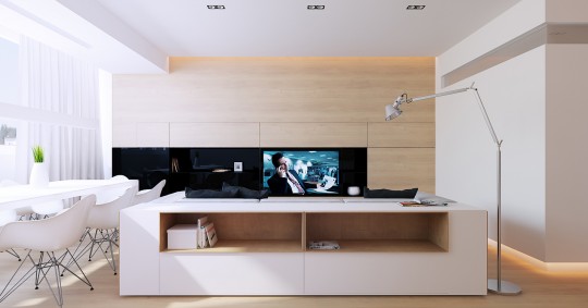 J’adore également l’espace TV avec le téléviseur encastré dans un module noir. Evidemment, la disposition du canapé ne laisse pas la place à un autre usage que celui de regarder la télévision… Un vrai appartement de geek (célibataire) en somme.