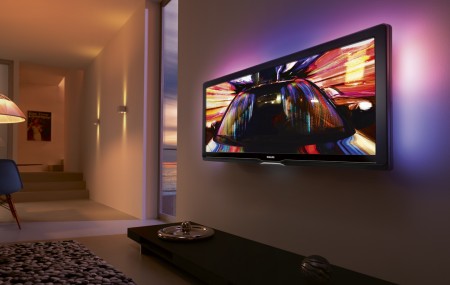 Sur cette photo, la nouveauté Philips 2009 : la TV LCD 21/9, un format cinéma à domicile pour un spectacle intense, couplé avec le système lumineux Ambilight spectra pour une déco design et une immersion cinématographique intense. Le téléviseur ultime du geek cinéphile.